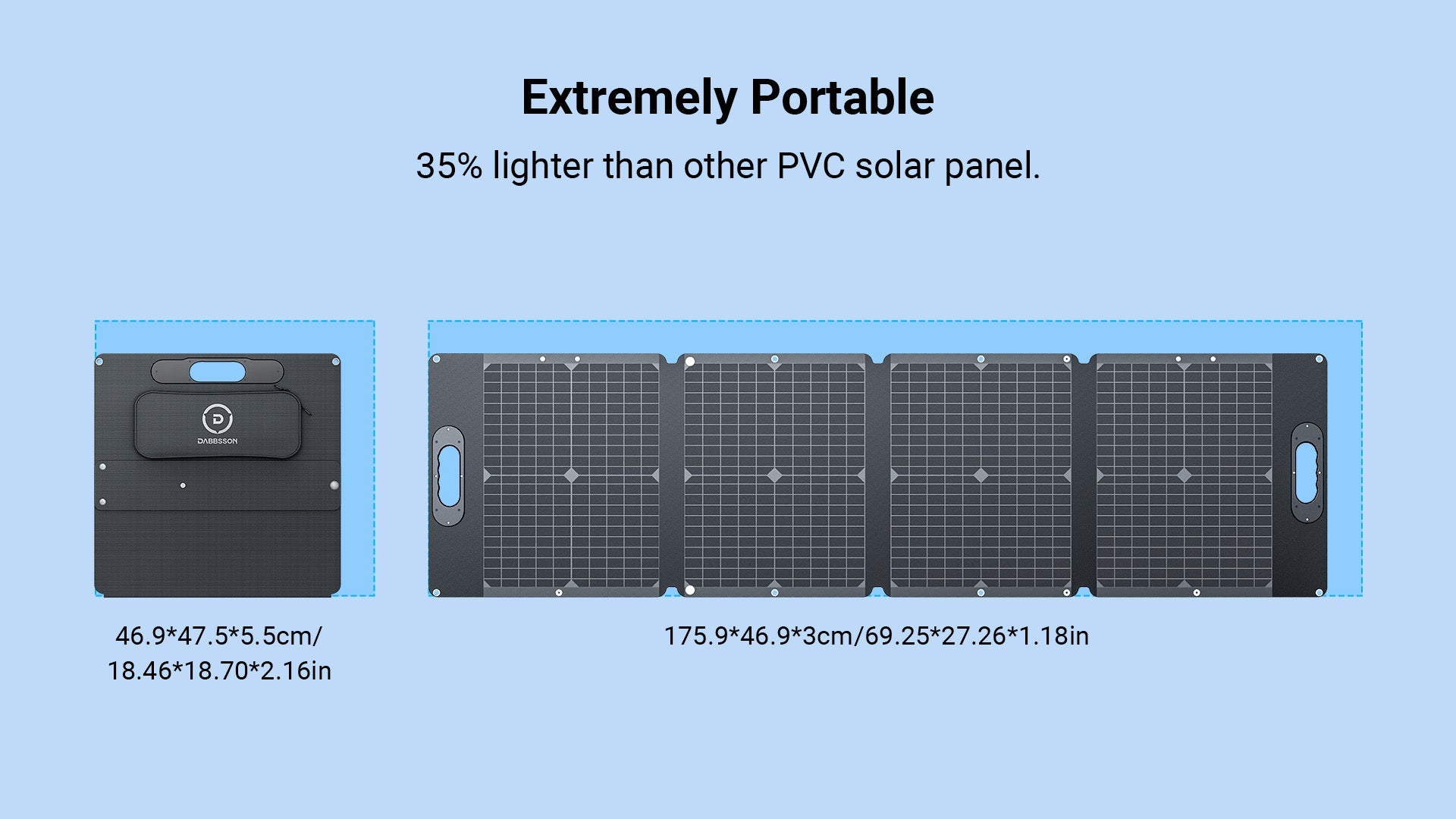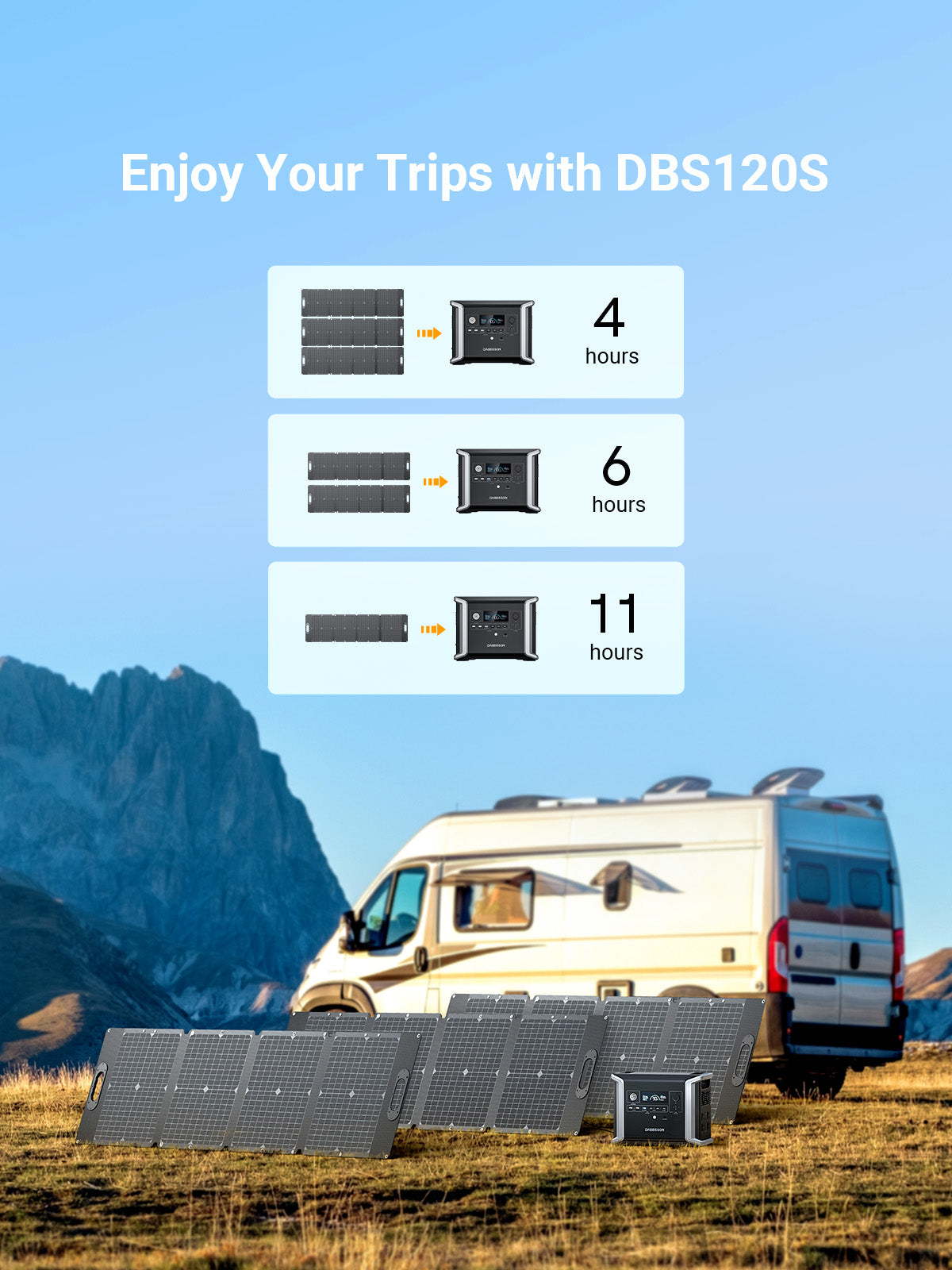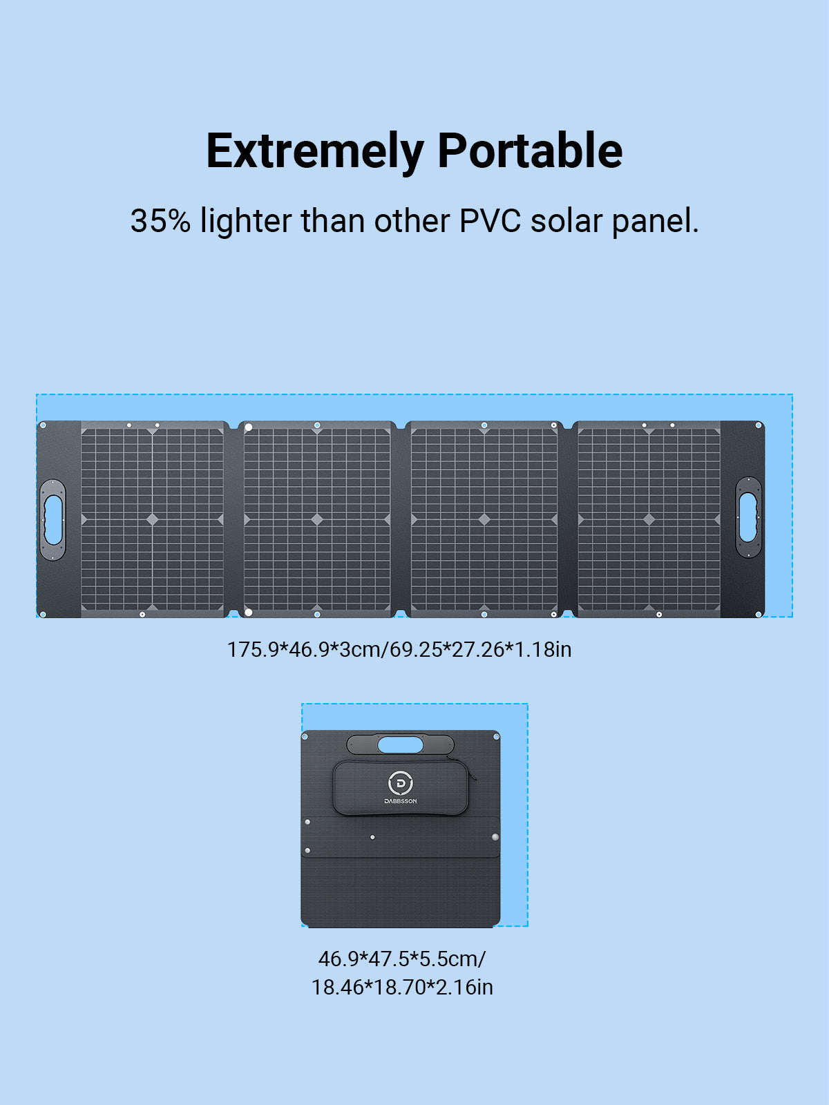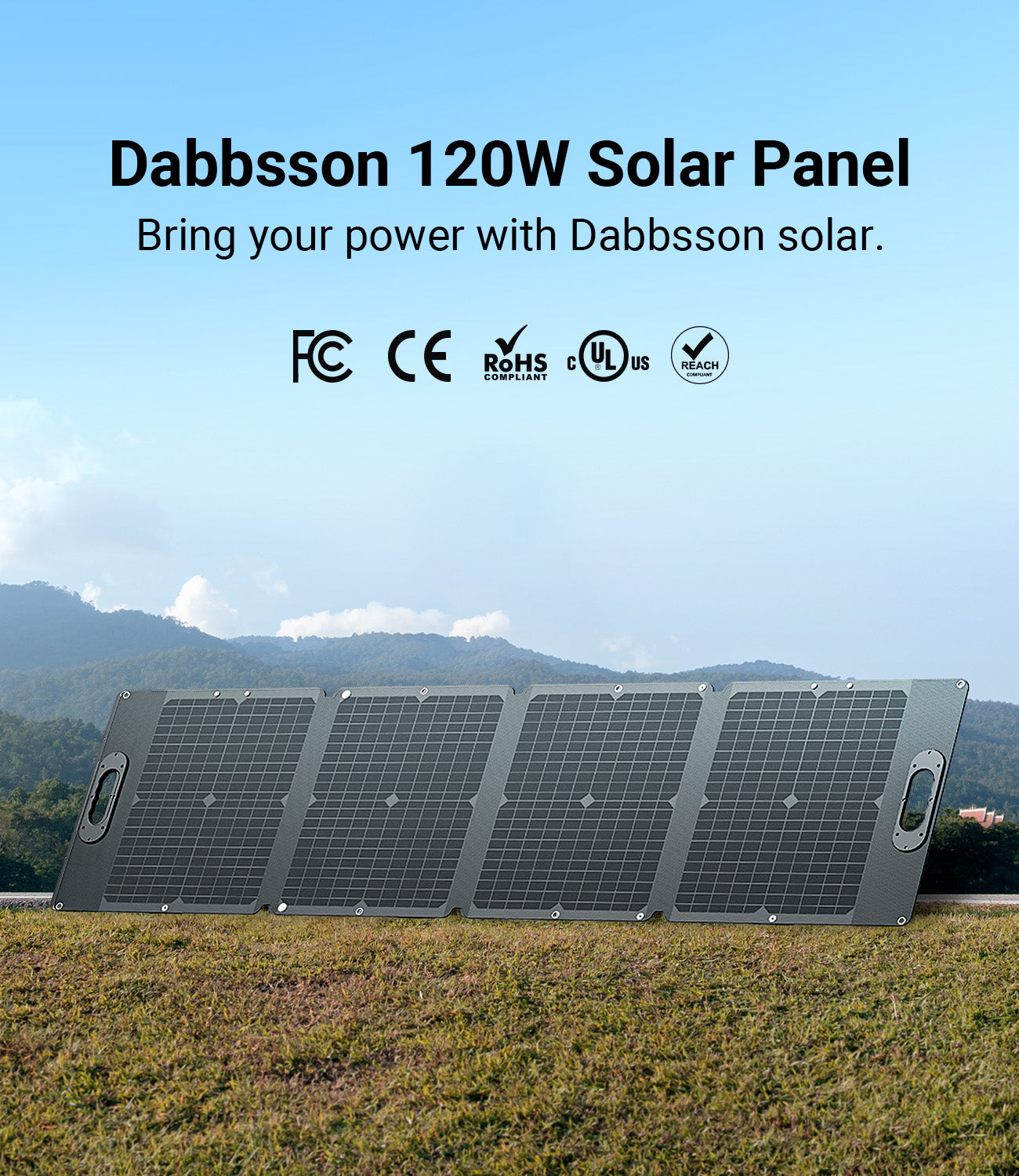 - Reliable Carbon Fiber Material - Constructed with carbon fiber reinforced polymer materials, the Dabbsson 120W Portable Solar Panel possesses an enduring maximum of 2800MPa, nine times stronger than steel, making it reliable energy for outdoor adventures, remote work sites, and extreme environments..